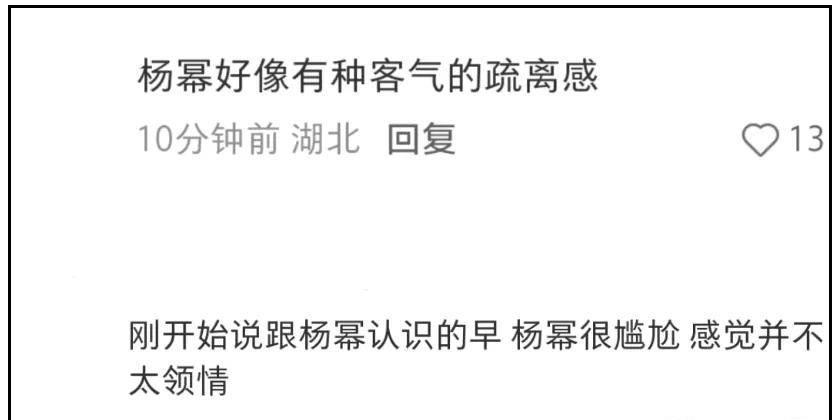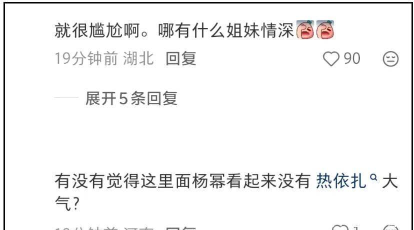 相关视频评论区,不止一位网友察觉到了二人互动别扭,有人一不小心说了大实话,指出杨幂和热依扎之间存在正面事业竞争,互相有点情绪并不意外。