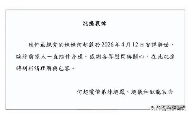 声明里有一句话,后来被无数人反复引用:"我们最亲爱的妹妹何超蕸于2026年4月12日安详辞世,临终前家人一直陪伴身边。感谢各界慰问与关心,在此沉痛时刻祈请理解与包容。"