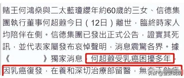 《星岛头条》独家披露:何超蕸受乳癌困扰多年,此次因乳癌复发,在养和医院深切治疗部留医,最终不敌病魔。