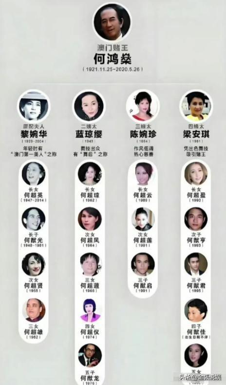 要搞清楚何超蕸是谁,得先搞清楚何家二房是什么格局。何鸿燊一生娶了四房太太。