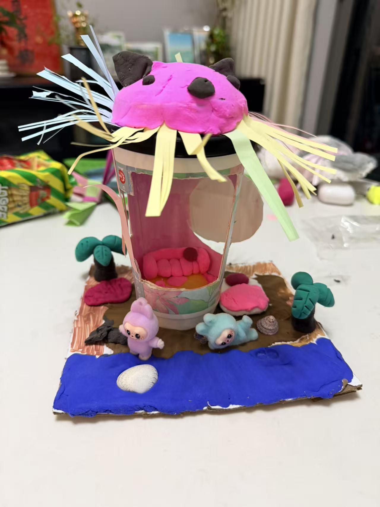“她用一个奶茶杯子,简单挖了一个洞,就说房子造好了,洞就是那扇门。”第二天上学前,龚先生见到了女儿的作品,丑到没眼看,临时用彩泥捏了两只猫耳朵,黏在奶茶杯子上,搞了一点小造型。