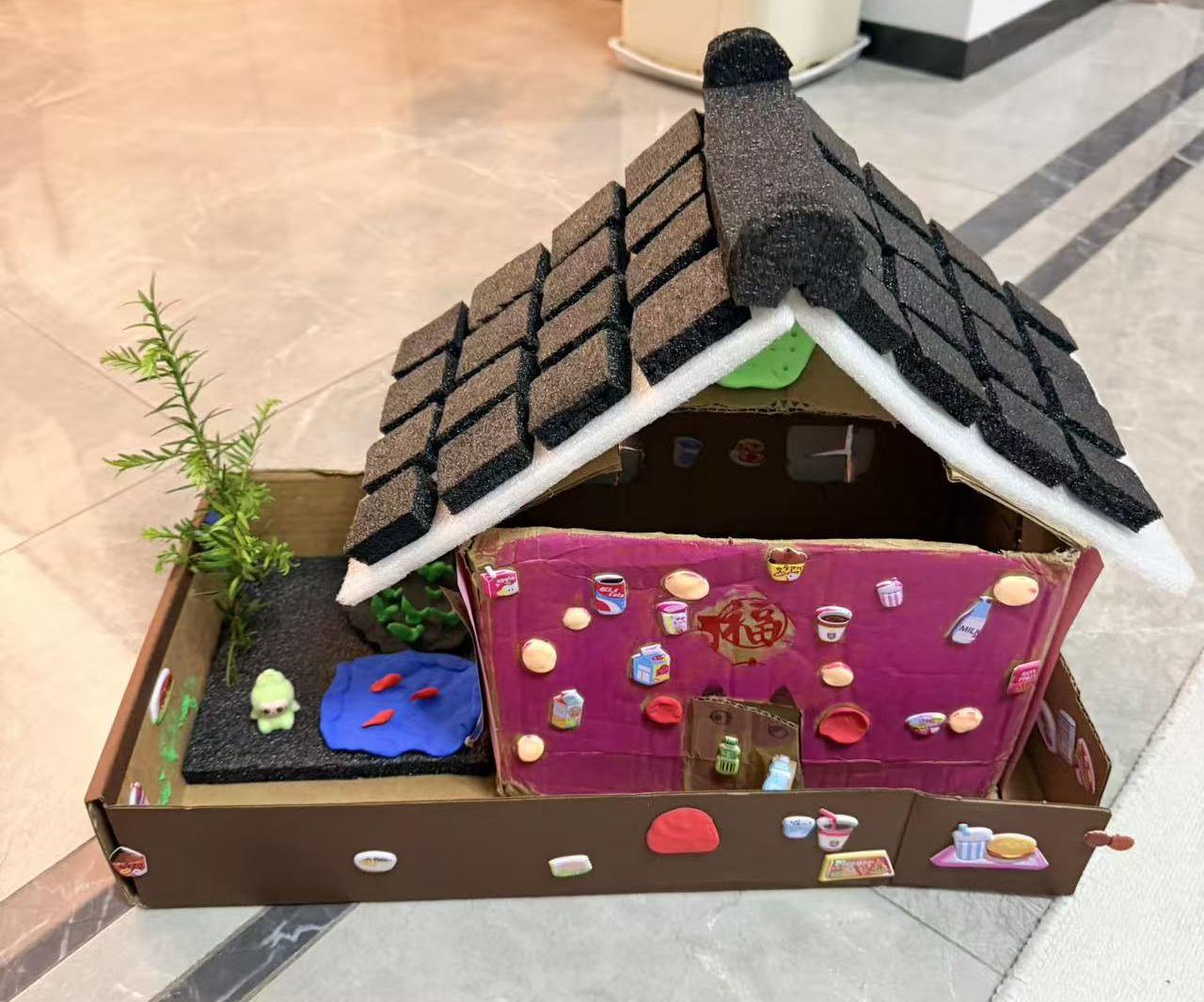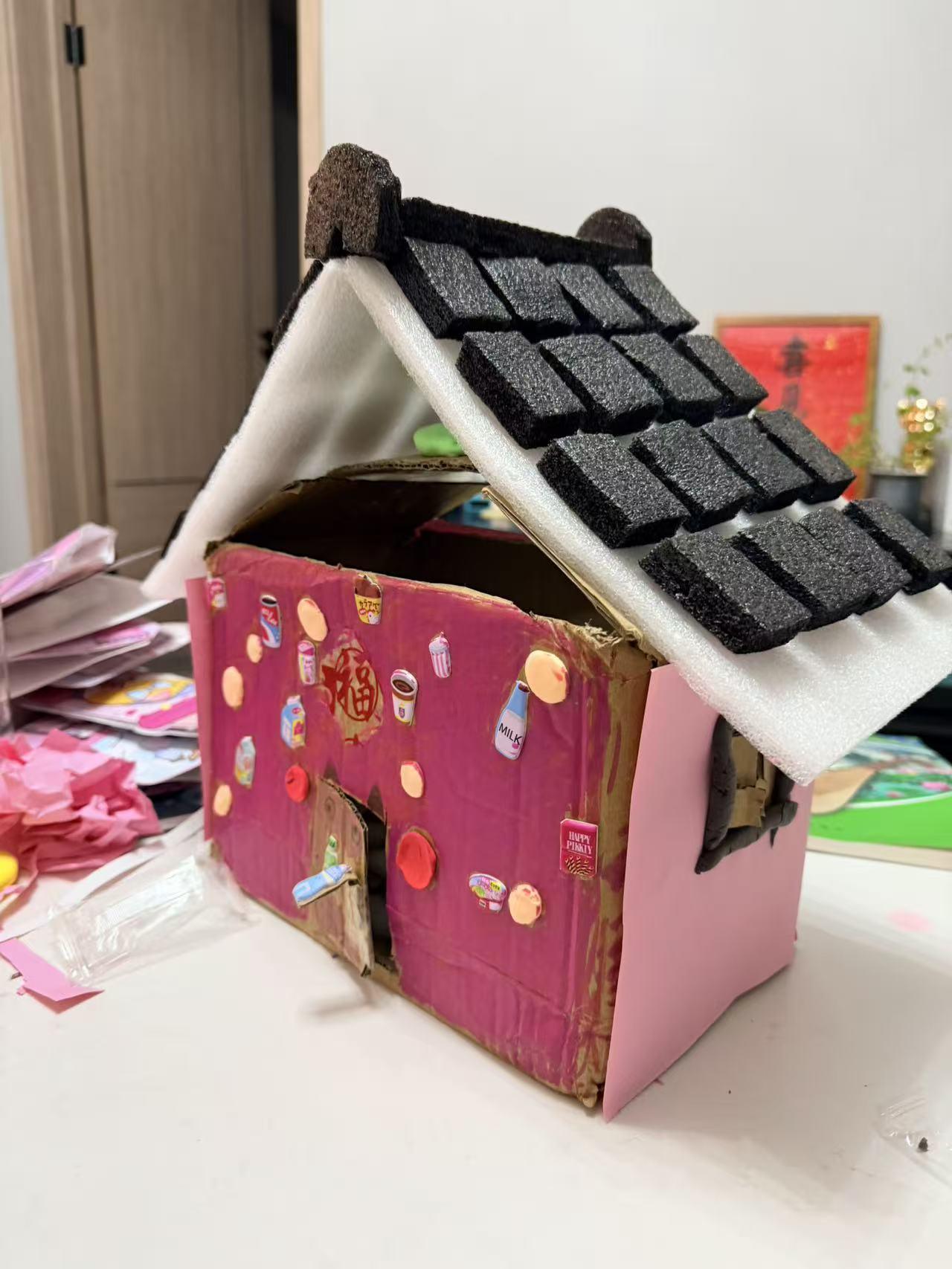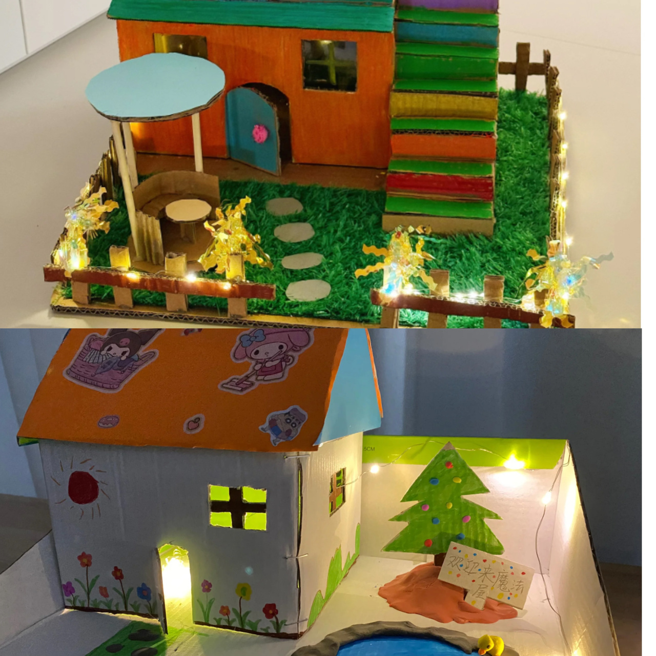 确实,在手工作品这条赛道上,家长们都成了隐藏的艺术家——彩泥、黏土、白乳胶、KT板、马赛克片、热熔胶、鞋盒子……一切皆可取材,万物皆能造屋。有人用心地为KT板贴上精美墙纸,有人甚至装上了会发光的LED灯,整栋房子被点亮,氛围感拉满。