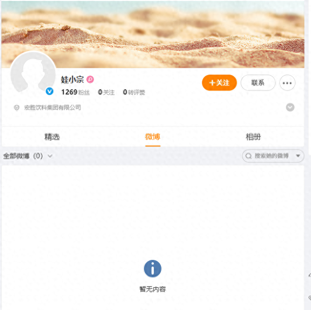 10月11日,微博显示,一个名为“娃小宗”的微博账号已完成平台认证,认证主体为宏胜饮料集团有限公司,审核通过时间为9月30日,目前粉丝数1269,但暂未发布任何内容。